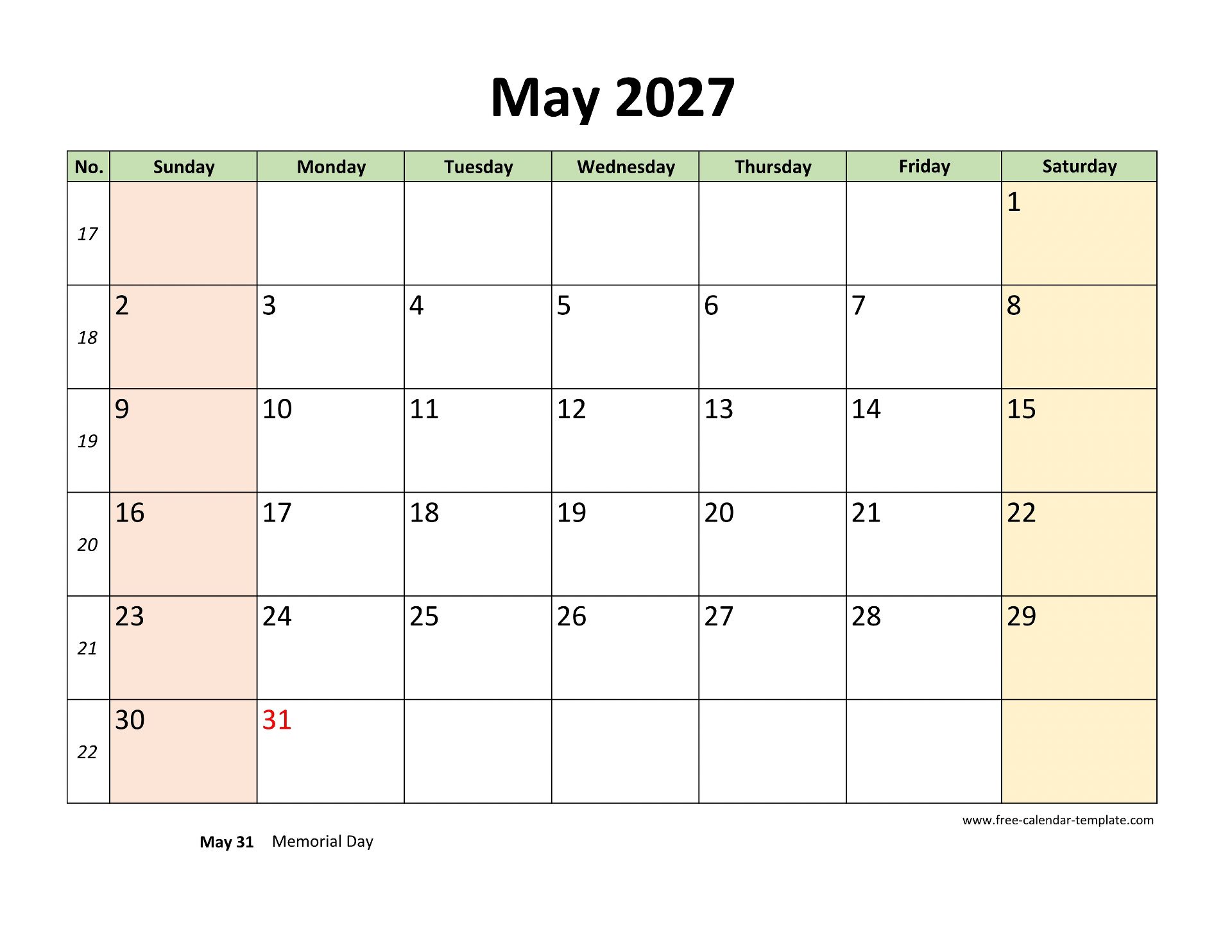 May 2027 Calendar Printable with coloring on weekend, large box on each day for notes. Free May 2027 Calendar Printable, week starts on Sunday, US letter format (horizontal layout), one month per page, 12 pages. Available in DOCX (MS Word), PDF (Adobe Reader PDF) and JPG. Free download and print, non-commercial use only.