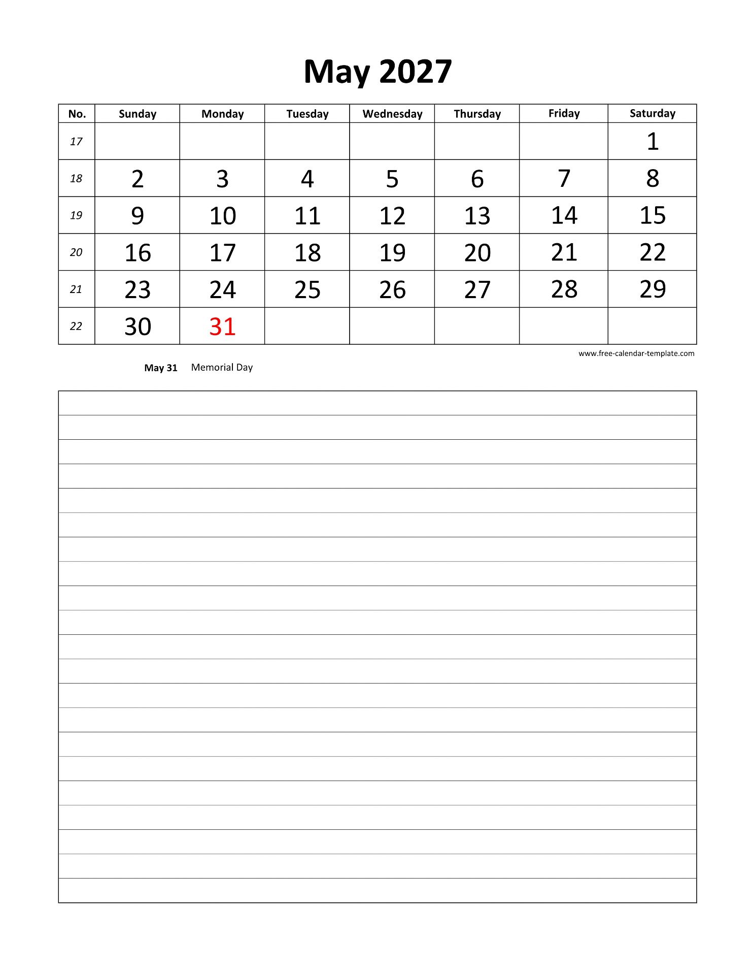 Printable 2027 May Calendar with grid lines for notes on the bottom for each day. Free Printable 2027 May Calendar, weeks starting on Sunday, US letter paper format (vertical layout), 12 months calendar on each page. Free download as DOCX (MS Word), PDF (Adobe Reader PDF) and JPG.