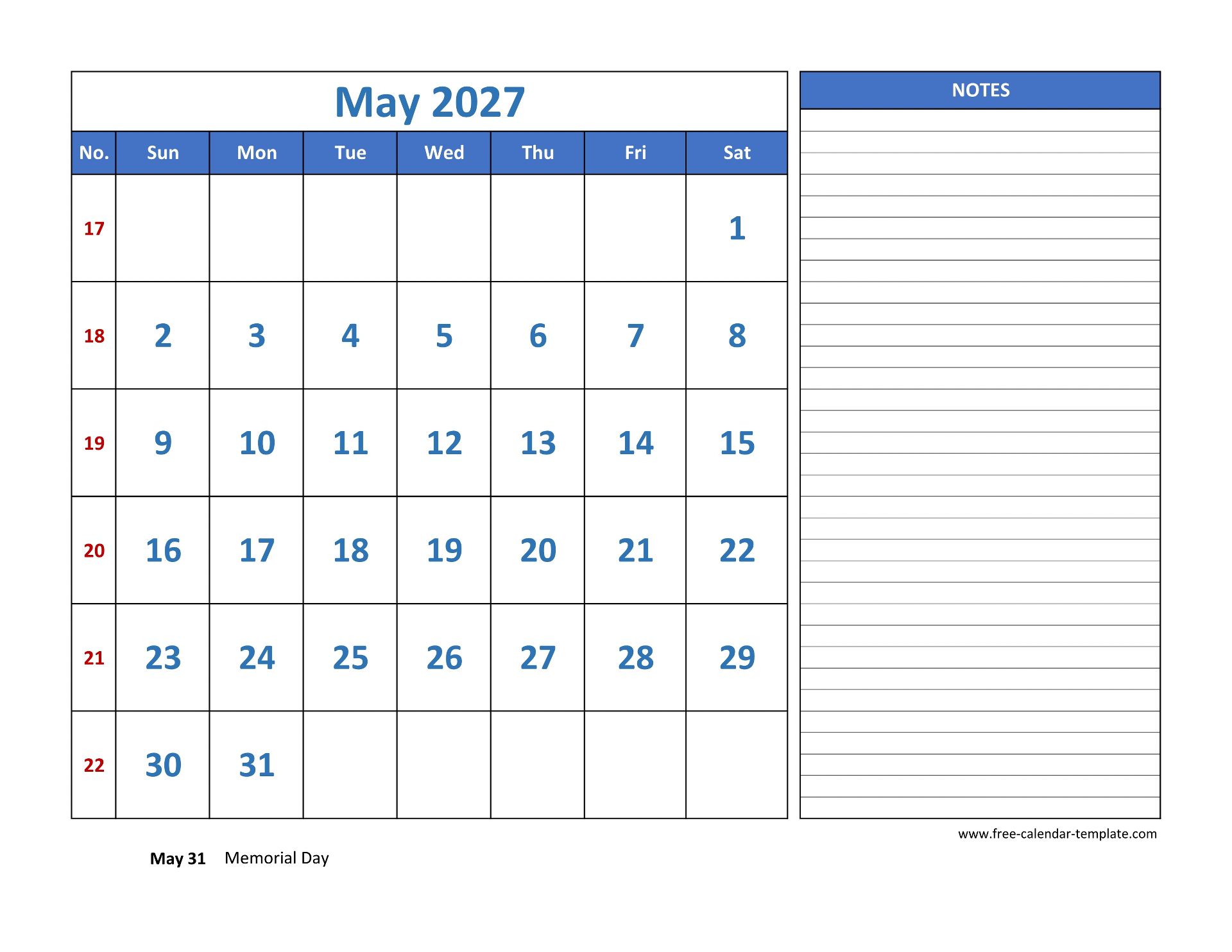 May Calendar 2027 with grid lines for holidays and notes, including week numbers, holidays on red and listed on the right. Free May Calendar 2027, weeks starting with Sunday, US letter format (horizontal layout), one month calendar printed on each page. The available file formats are DOCX (MS Word), PDF (Adobe Reader PDF) and JPG. Free download and print at home or at work.
