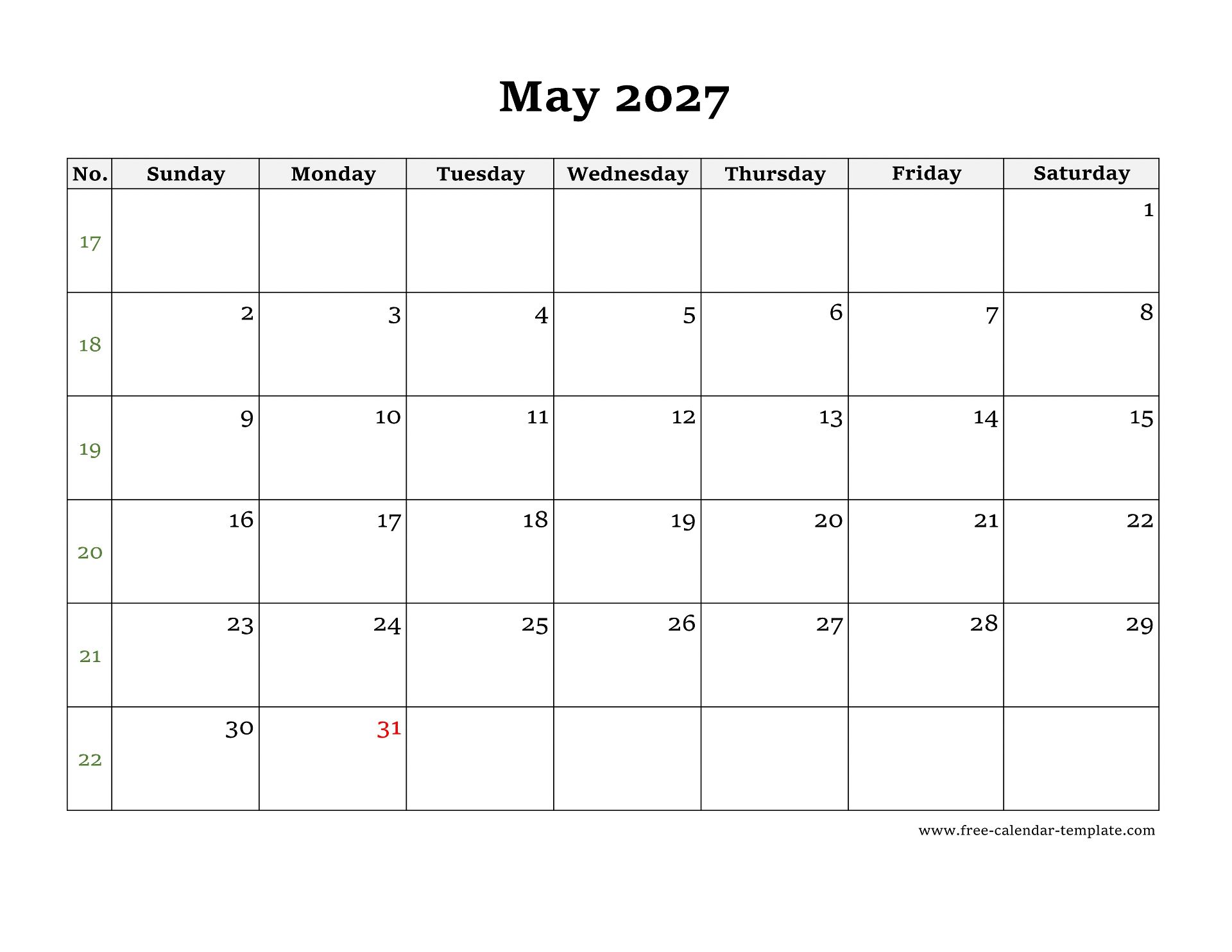 Simple May Calendar 2027 with large box on each day for notes, holidays on red. May Calendar 2027, week starts on Sunday, US letter format (horizontal/landscape layout), 12 pages for 12 months calendar. Download as DOCX (MS Word), PDF (Adobe Reader PDF) and JPG and print, non-commercial use only.