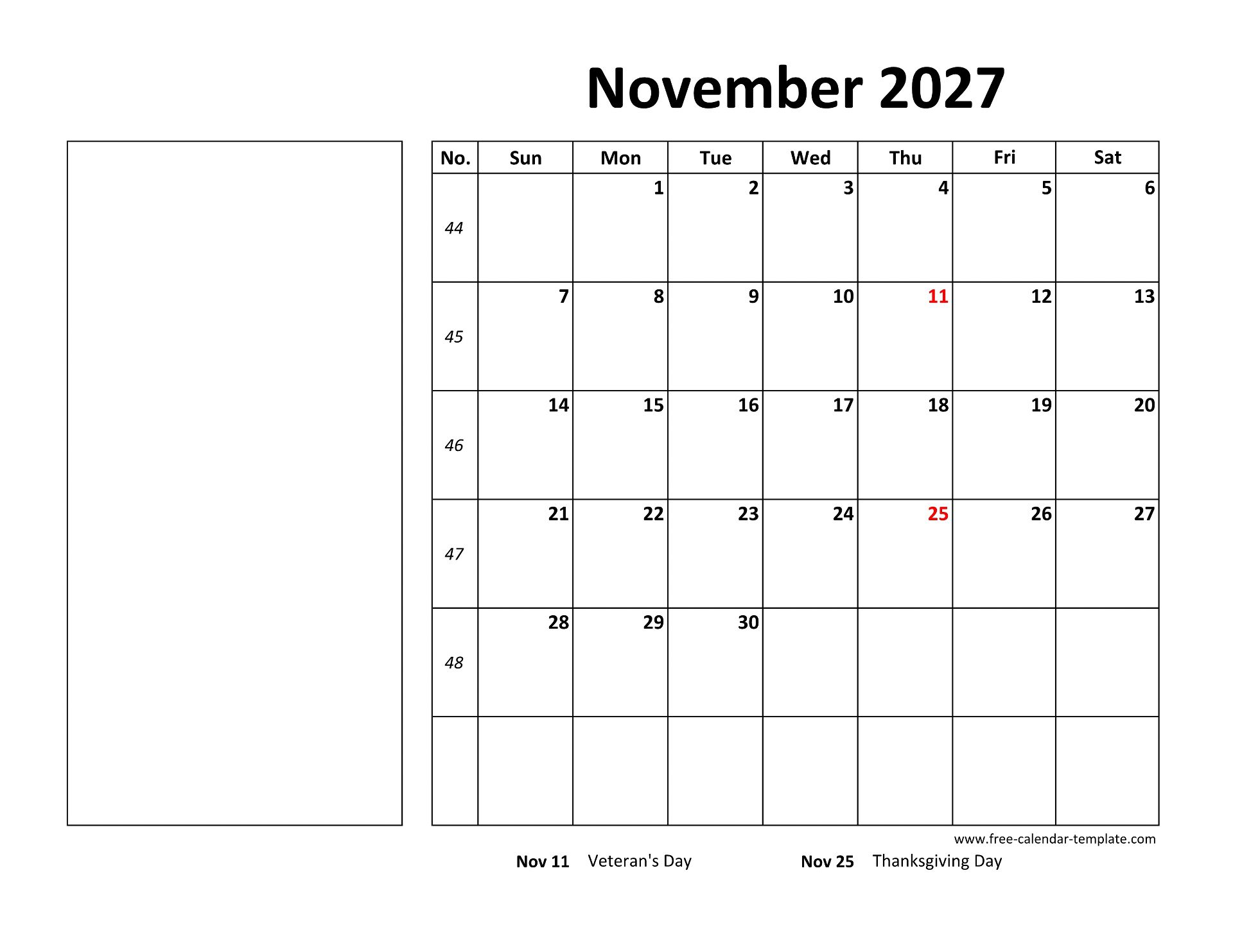 Printable November 2027 Calendar with holidays, week numbers, large box for each day and grid line for notes. Free Printable November 2027 Calendar, week starts on Sunday, US letter format (horizontal layout), one month calendar printed on each page. The available file formats are DOCX (MS Word), PDF (Adobe Reader PDF) and JPG. Free download and print at home or at work.