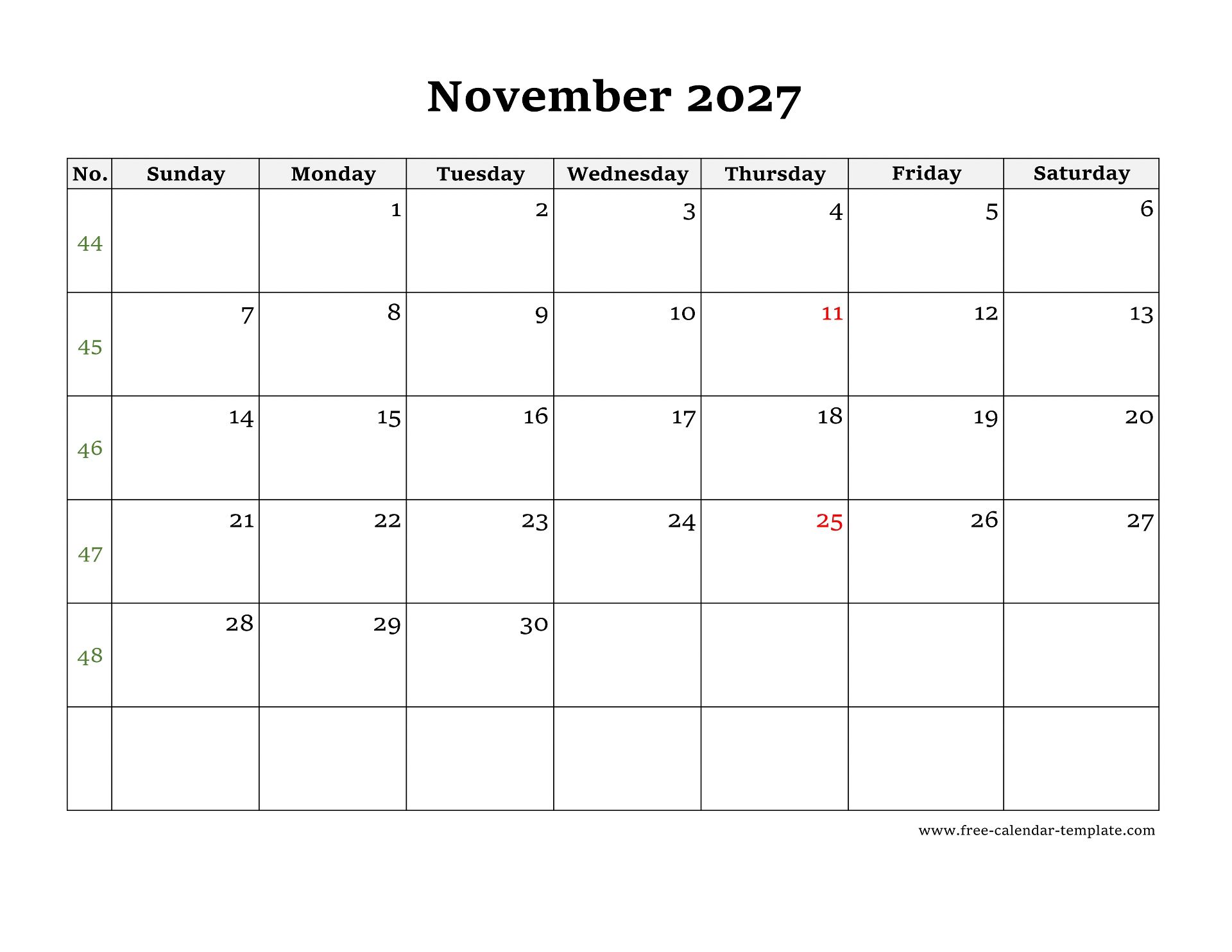 Simple November Calendar 2027 with large box on each day for notes, holidays on red. November Calendar 2027, week starts on Sunday, US letter format (horizontal/landscape layout), 12 pages for 12 months calendar. Download as DOCX (MS Word), PDF (Adobe Reader PDF) and JPG and print, non-commercial use only.
