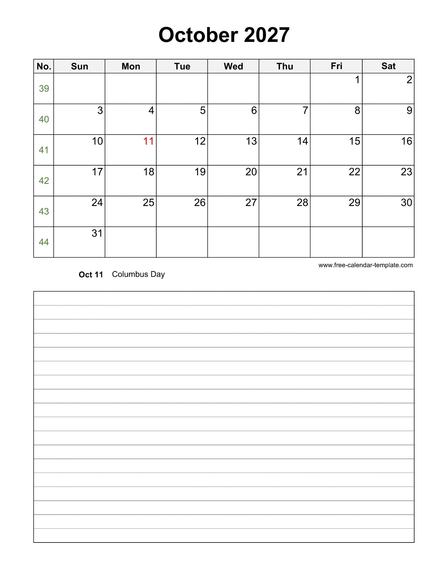 Printable October 2027 Calendar with with space for notes and events, appointments, including week numbers, US federal holidays. Free October 2027 Calendar, week starts on Sunday, US letter format (vertical/portrait layout), one month calendar on each page (12 pages). Available in DOCX (MS Word), PDF and JPG. Free download and print.