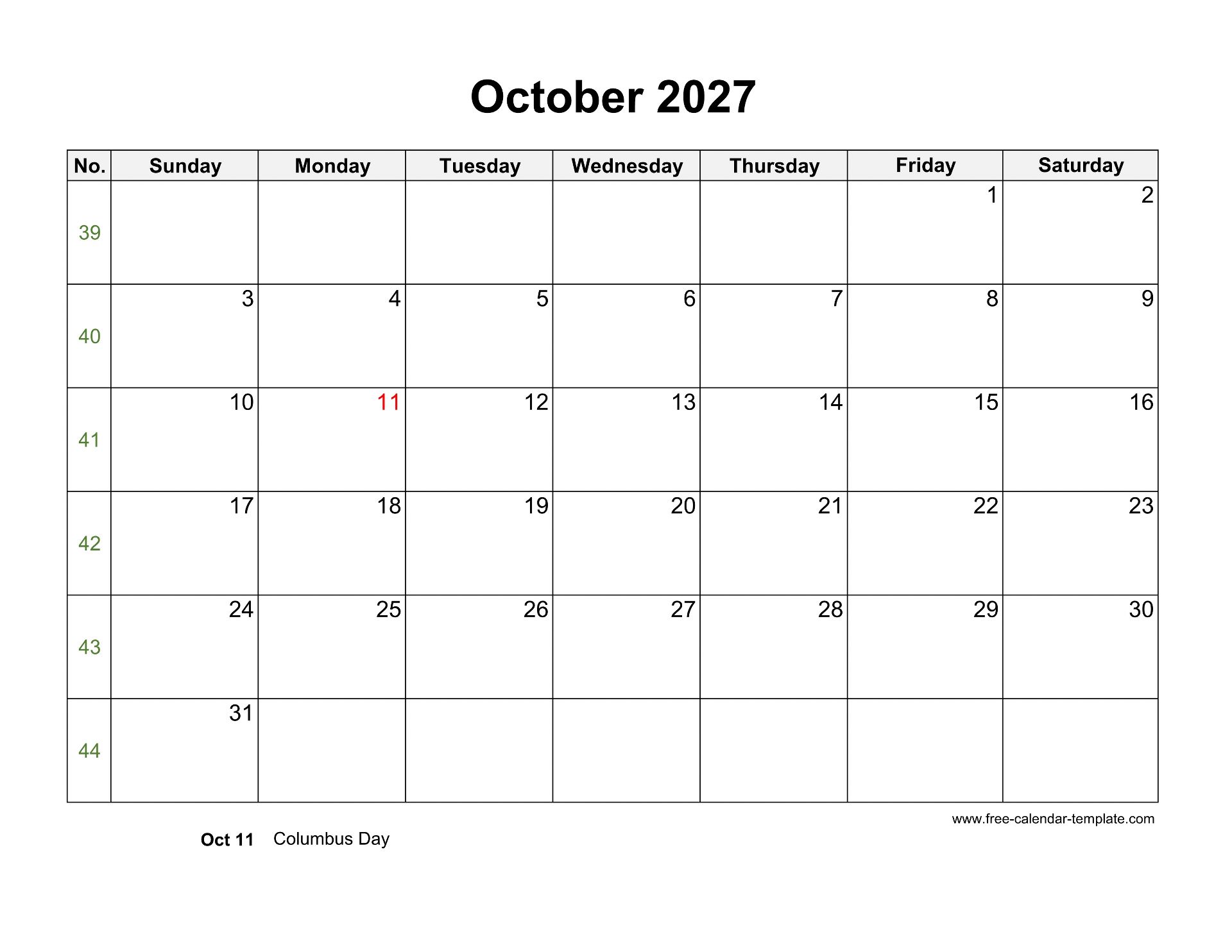 Free 2027 Calendar Blank October Template including us holidays, week numbers, large box for notes. Free 2027 Calendar, week starts on Sunday, US letter format (horizontal/landscape layout), 12 pages - one month per page. Download as DOCX (MS Word), PDF (Adobe Reader PDF) and JPG and print, non-commercial use only.