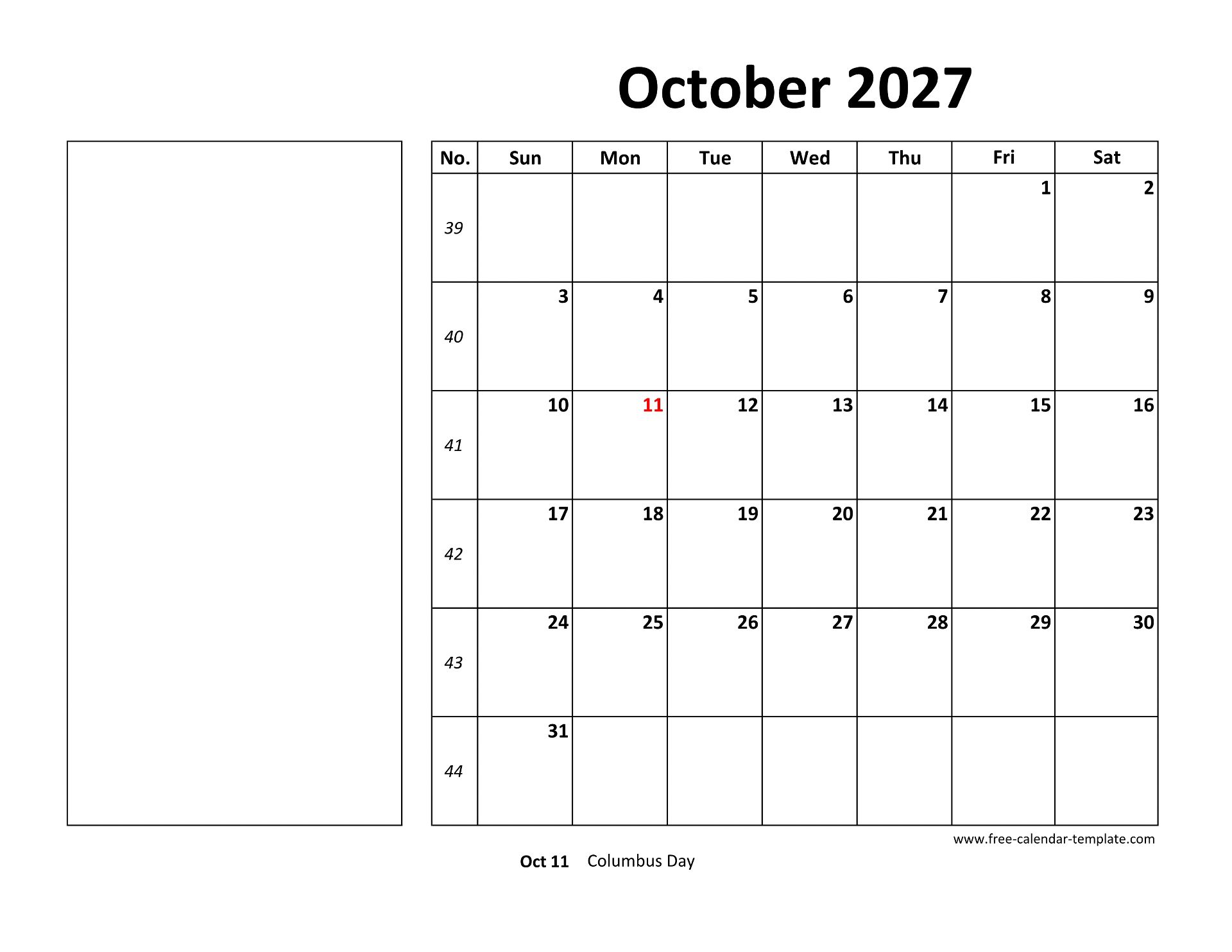 Printable October 2027 Calendar with holidays, week numbers, large box for each day and grid line for notes. Free Printable October 2027 Calendar, week starts on Sunday, US letter format (horizontal layout), one month calendar printed on each page. The available file formats are DOCX (MS Word), PDF (Adobe Reader PDF) and JPG. Free download and print at home or at work.
