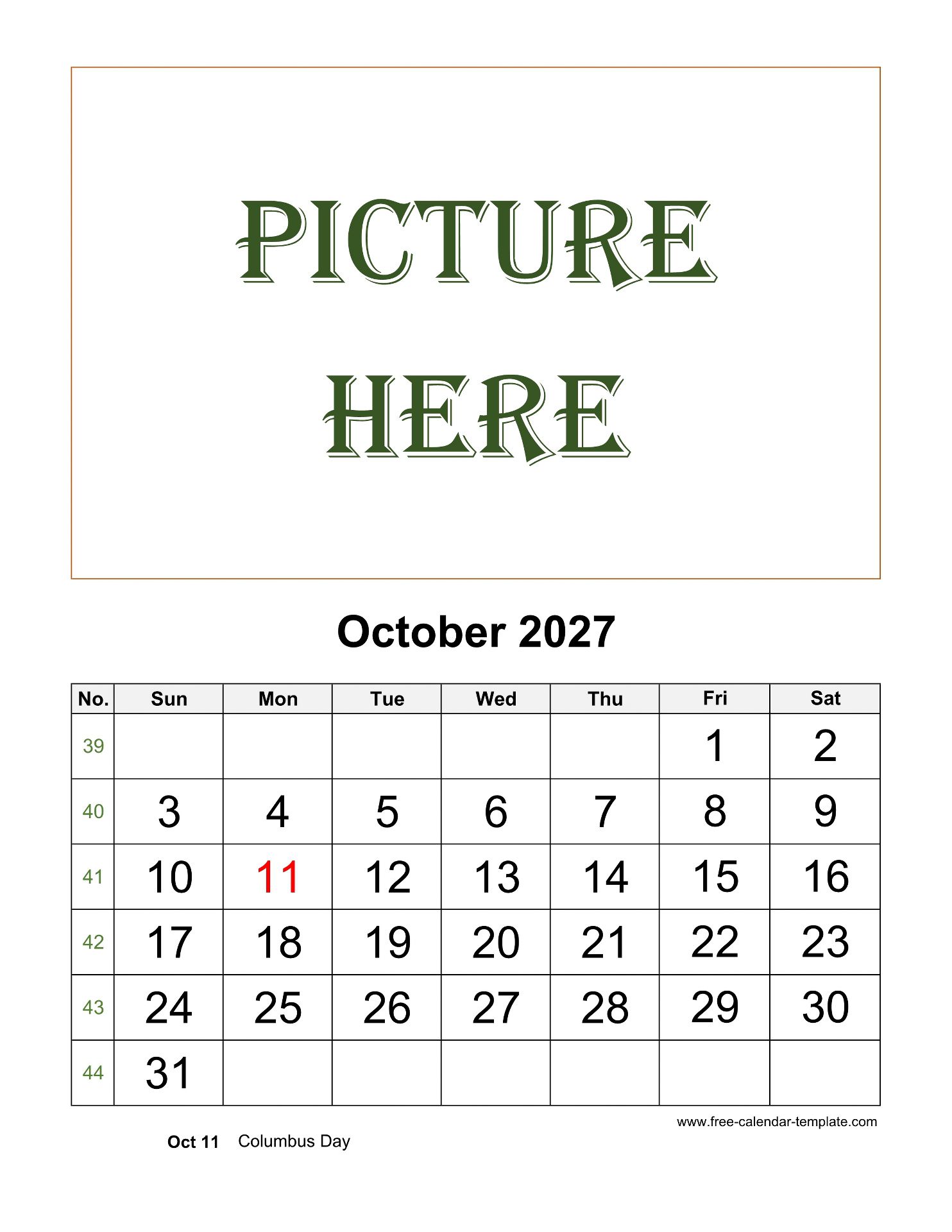 October Printable 2027 Picture Calendar, pictures can be placed at the top of each month. Free 2027 Picture Calendar, weeks starting on Sunday, US letter paper format (vertical/portrait layout), 12 months calendar on each page. Free download as DOCX (MS Word), PDF (Adobe Reader PDF) and JPG.