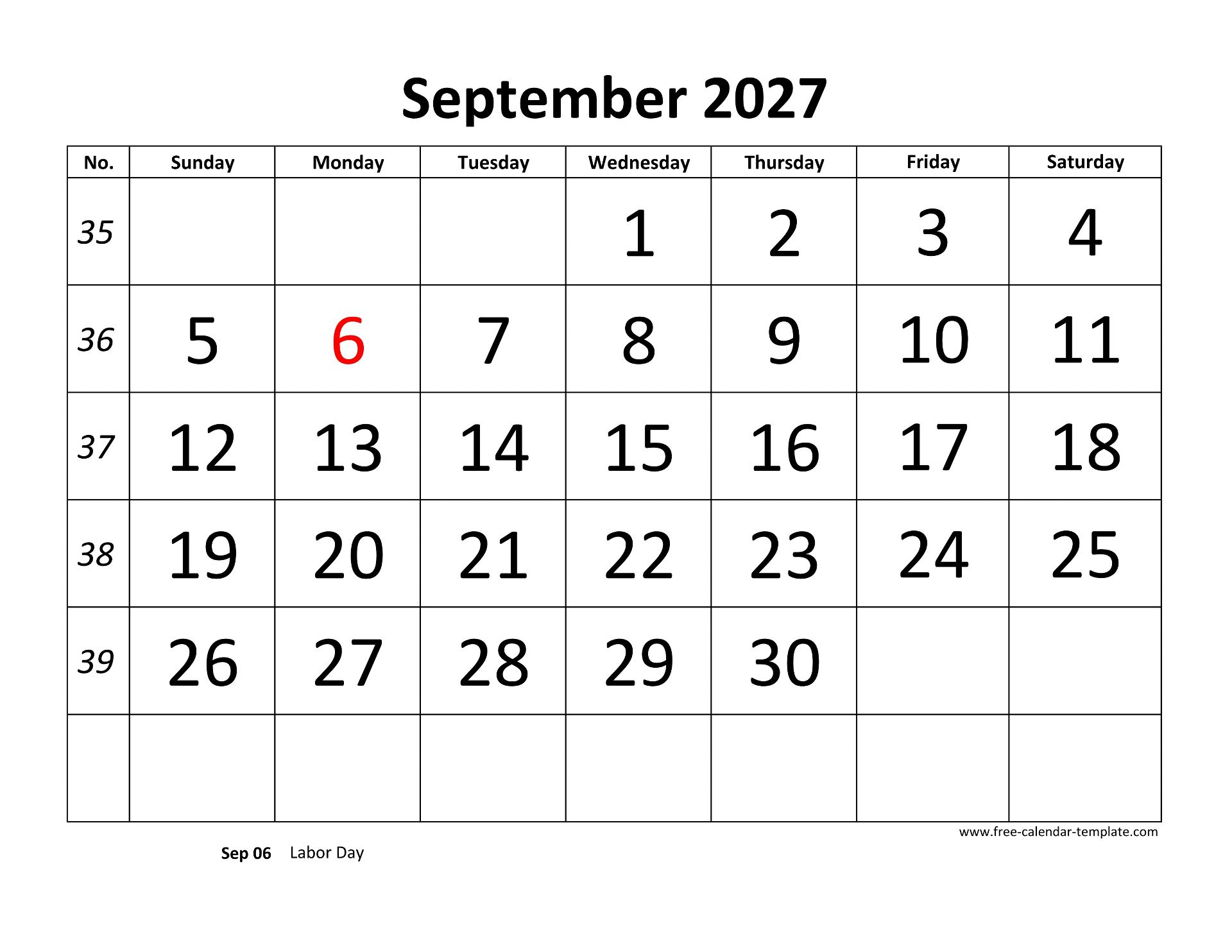 September 2027 Calendar designed with large font, US holidays on red. Free September 2027 Calendar, week starts on Sunday, US letter format (horizontal layout), one month calendar printed on each page. The available file formats are DOCX (MS Word), PDF (Adobe Reader PDF) and JPG. Free download and print at home or at work.