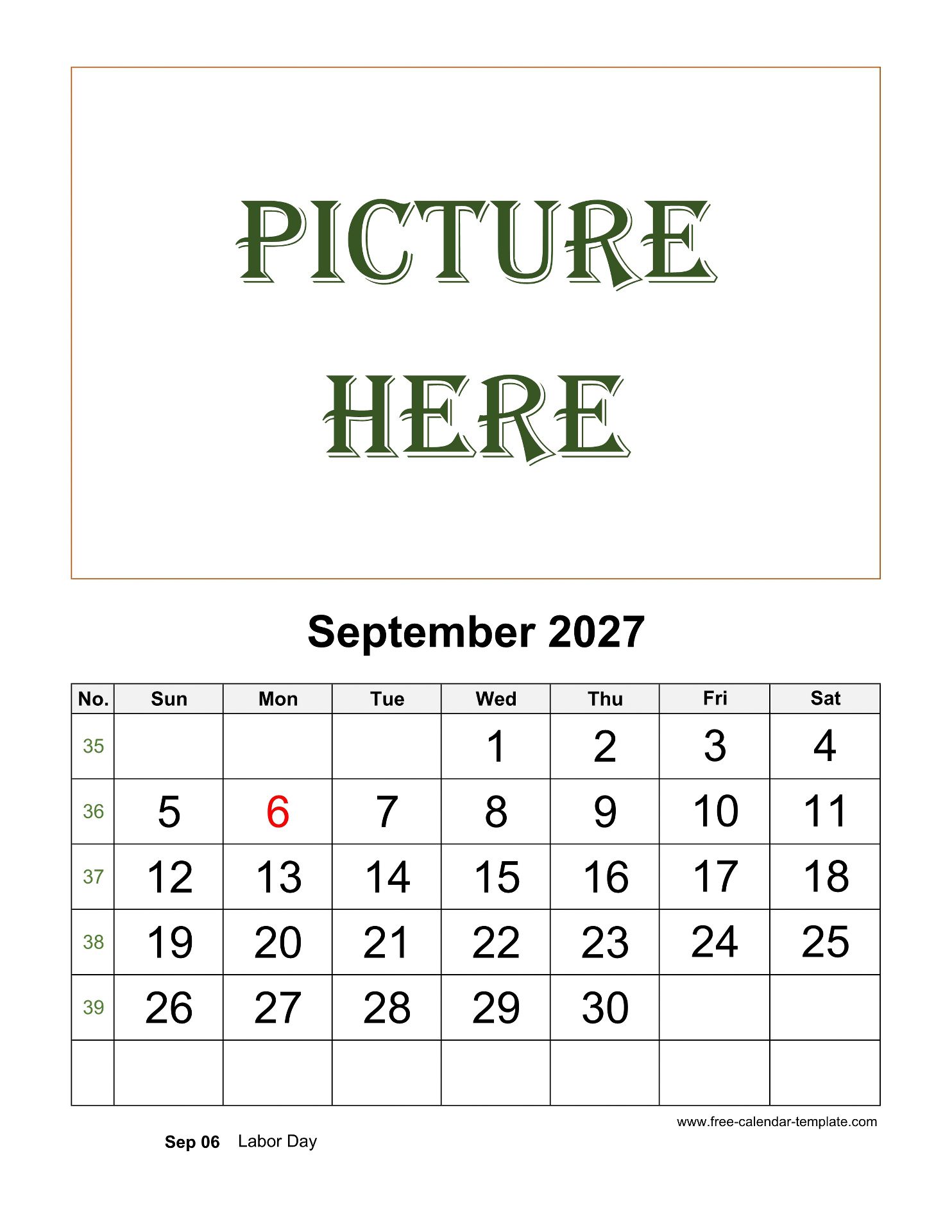 September Printable 2027 Picture Calendar, pictures can be placed at the top of each month. Free 2027 Picture Calendar, weeks starting on Sunday, US letter paper format (vertical/portrait layout), 12 months calendar on each page. Free download as DOCX (MS Word), PDF (Adobe Reader PDF) and JPG.