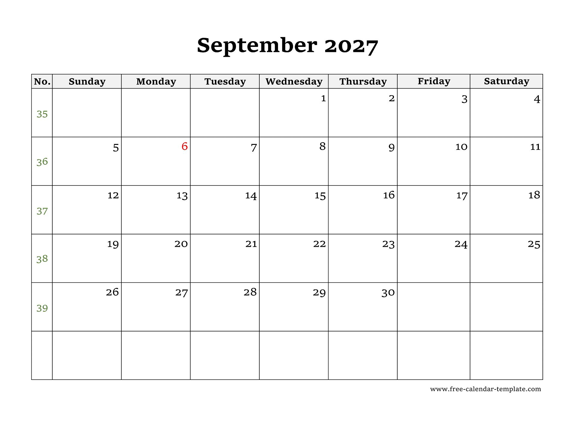 Simple September Calendar 2027 with large box on each day for notes, holidays on red. September Calendar 2027, week starts on Sunday, US letter format (horizontal/landscape layout), 12 pages for 12 months calendar. Download as DOCX (MS Word), PDF (Adobe Reader PDF) and JPG and print, non-commercial use only.