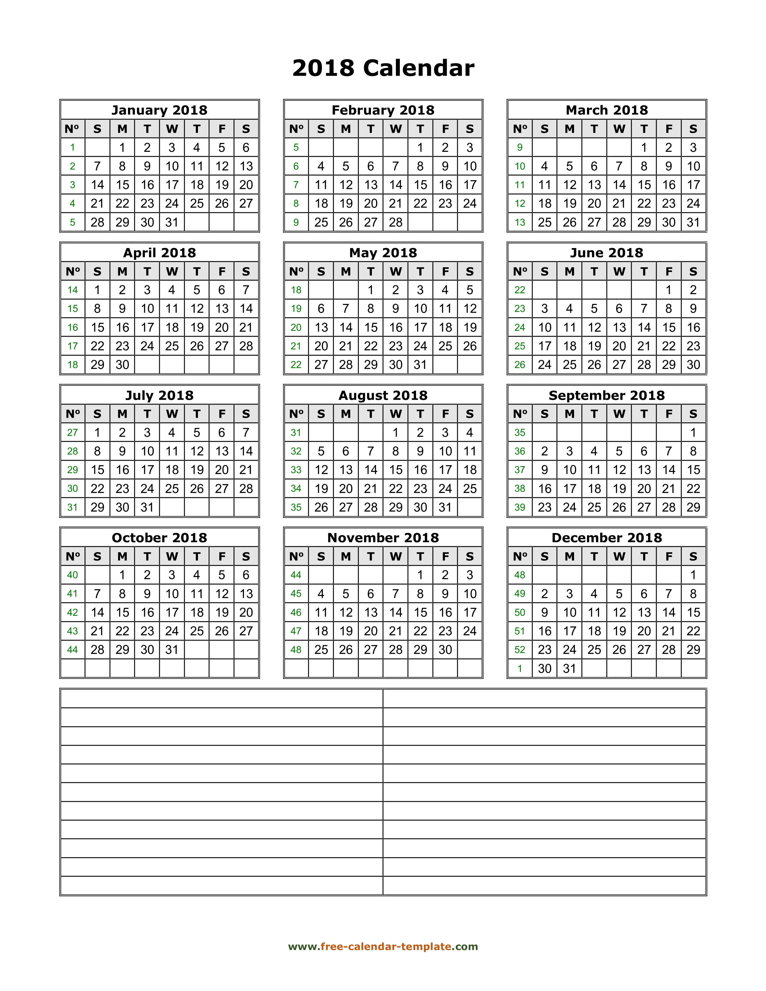 Yearly 2018 printable calendar with space for notes, events on the bottom, including week numbers. Free yearly 2018 printable calendar with notes, week starts on Sunday, US letter paper format (vertical/portrait layout), 12 months calendar printed on one page. Available in DOCX, PDF and JPG, free download and print.