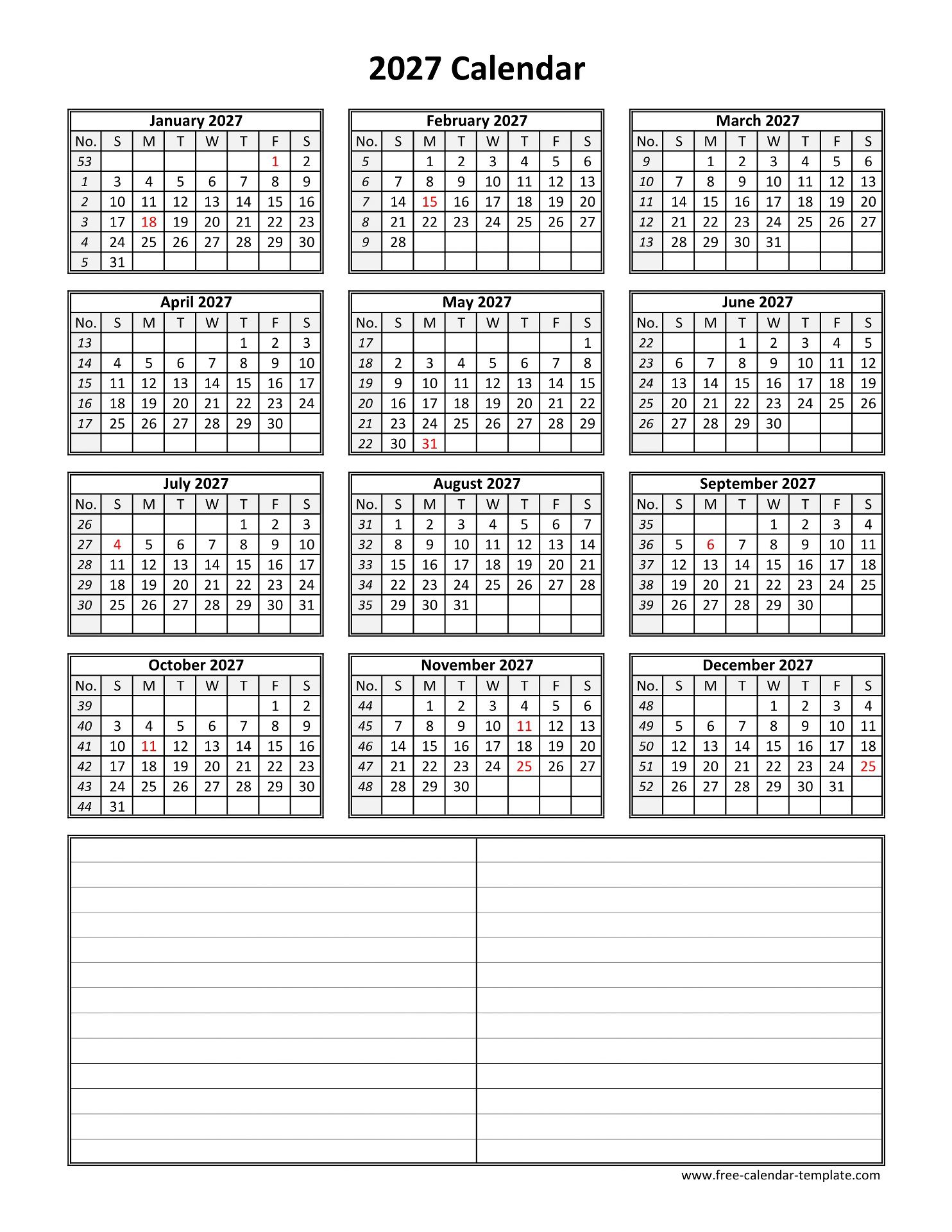 Yearly 2027 printable calendar with space for notes, events on the bottom, including week numbers. Free yearly 2027 printable calendar with notes, week starts on Sunday, US letter paper format (vertical/portrait layout), 12 months calendar printed on one page. Available in DOCX, PDF and JPG, free download and print.