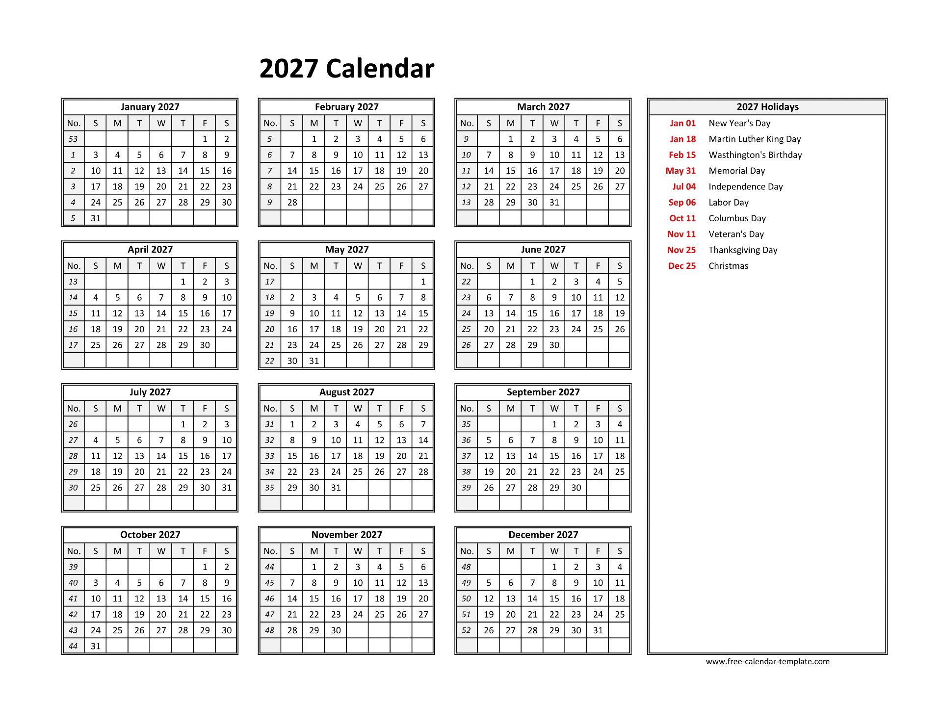 2027 yearly calendar printable with week numbers and US federal holidays listed on the left. Free 2027 yearly calendar printable week starts on Sunday, US letter paper format (horizontal/landscape layout), 12 months calendar printed on one page. The available file formats are DOCX (MS Word), PDF (Adobe Reader PDF) and JPG. Free download and print at home or at work.